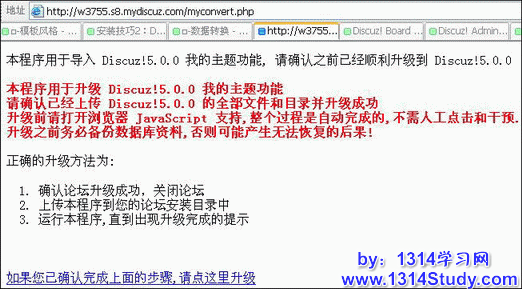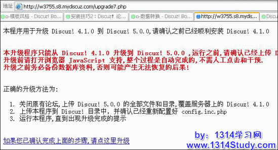 3、上传下载的 Discuz! 5.0 安装包的 ./utilities/upgrade7.php 到论坛程序根目录下,在浏览器中运行升级程序。如图 11 所示: