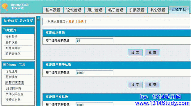 2、用管理员账号密码登录到论坛,进入系统设置,更新论坛统计,更新缓存。如图 16 所示: