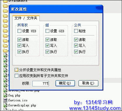 1、上传 Discuz! 5.0(除install.php文件外)的所有程序文件到服务器覆盖原 Discuz!4.1 程序,并修改 attachments、customavatars 、forumdata 、./forumdata/cache 、./forumdata/templates 、./forumdata/threadcaches 、templates 的目录属性为777。如图 7、8、9 所示: