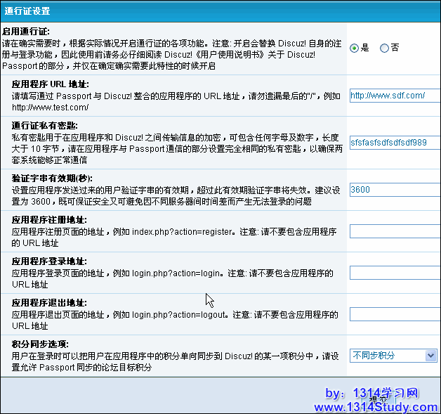 首先第一项启用通行证是开关,填写好准确的应用程序url地址,为了保证传输的安全,后台得设置一个私有密钥,这个密钥待会在你写主程序的通行证的时候也得用到,还有就是设置验证字串的有效期,这邪恶都是为安全考虑的,应用程序的注册、登录、退出的地址也要设置好,Discuz!通行证还可以同步一个单项积分,所以可以后台设置需要同步哪个单项积分。