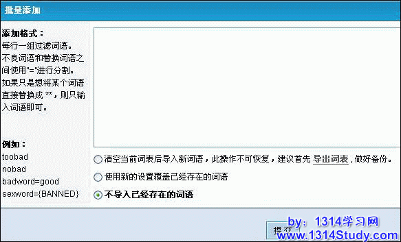 如需禁止发布包含某个词语的文字,而不是替换过滤,请将其对应的替换内容设置为{BANNED}即可;如需当用户发布包含某个词语的文字时,自动标记为需要人工审核,而不直接显示或替换过滤,请将其对应的替换内容设置为{MOD}即可。