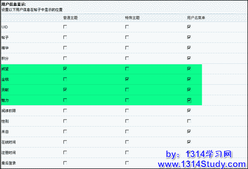 在帖子中显示:当扩展积分设置为“在帖子中显示”后,您还需要到“界面与显示方式”设置显示在帖子中的具体位置。“界面与显示方式”的设置如下图所示,可以设置每种扩展积分在不同的位置显示。提供三种显示位置:普通主题,特殊主题,用户名菜单。