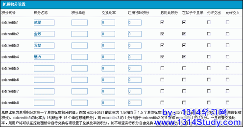 Discuz!提供了8种扩展积分,站长可以灵活定义每种扩展积分的基本属性,包括:扩展积分名称,扩展积分单位,积分兑换比例,注册初始积分,启用此积分,在帖子中显示,允许兑出,允许兑入。