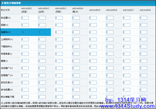 扩展积分增加策略的本质就是设置如何增加或者减少会员的某项扩展积分。举一例说明:会员的某个主题加入精华之后,该会员的扩展积分1---威望增加10个单位。如下图中有颜色标识的设置。