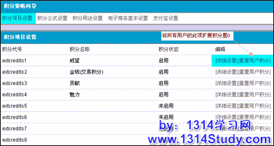 积分项目设置提供两个功能:1、单独每一种扩展积分的属性;2、重置用户积分。如下图: