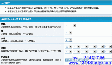 注意:除非您非常了解 Discuz! 结构,否则强烈建议不要修改计划任务的默认设置,并且在修改之前记录原有设置,不当的设置将可能导致论坛出现不可预期的错误。