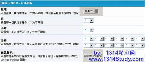 3、编辑新增计划任务的执行时间和任务脚本,如下图。例如自己添加的脚本名称是update.inc.php。
