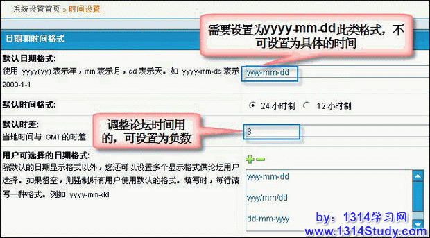 说明:这个功能主要涉及到后台时间设置与论坛的前台显示效果有关的一系列设置。下面主要介绍一下这个功能的使用方法和注意事项。