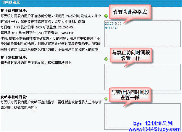 注意: 格式不正确将可能导致意想不到的问题,用户组中如开启“不受时间段限制”的选项,则该组可不被任何时间段设置约束。所有时间段设置均以论坛系统默认时区为准,不受用户自定义时区的影响