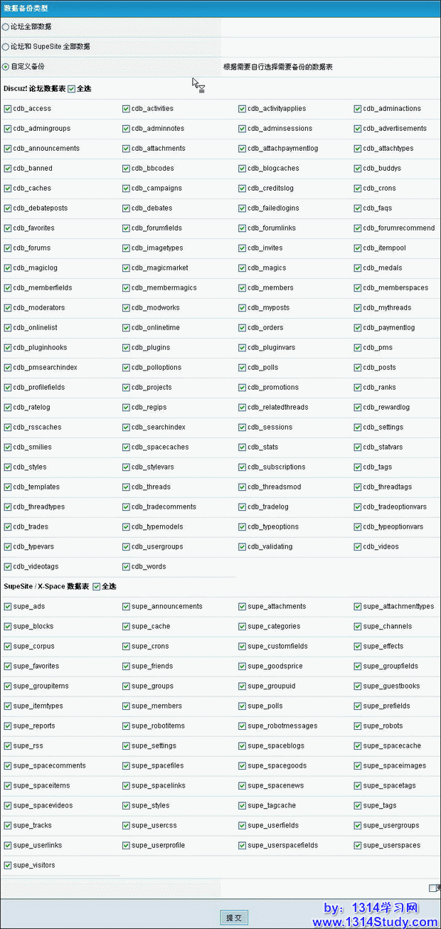 可以自定义备份 Discuz! 或者 SupeSite 的部分或者全部表,如图 2 所示: