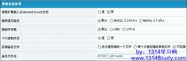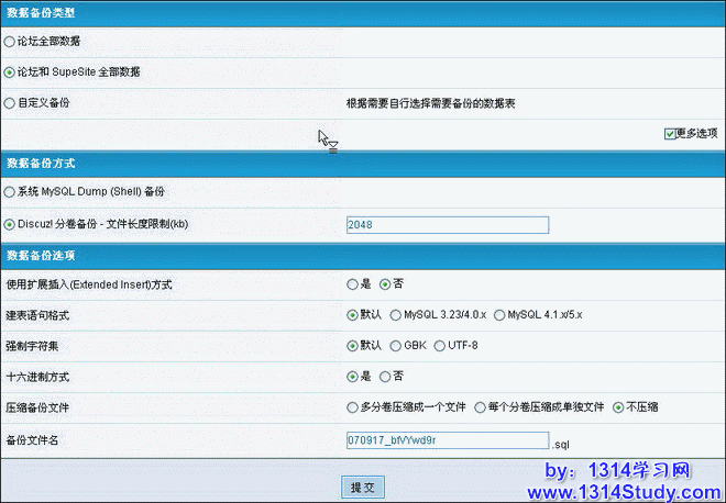 3、“强制字符集”:如果您只是备份数据,默认即可;如果您想将现在的数据导入一个跟现在数据库字符集不同的数据库里,比如您想将您 GBK 字符集的数据库导入 UTF-8 字符集的库里,在这里选择“UTF-8”备份再导入到一个数据库字符集都为 UTF-8 的论坛即可。当然这里如果选择不慎出错,恢复备份数据的时候很可能会导致乱码问题。