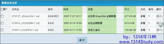 如果 ./forumdata/backup_xxx 目录下有备份文件,资料恢复这里就可以看到各个备份文件及其备份类型、备份时间、大小等属性,如图 7 所示: