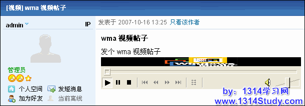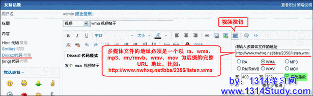根据上面的方法开启相应的 Discuz! 代码之后我们就可以开始使用它了,比如上面我们举例开启了 wma 代码,下面我们到开启 Discuz! 代码的论坛下发个 wma 帖子,如图 6 所示: