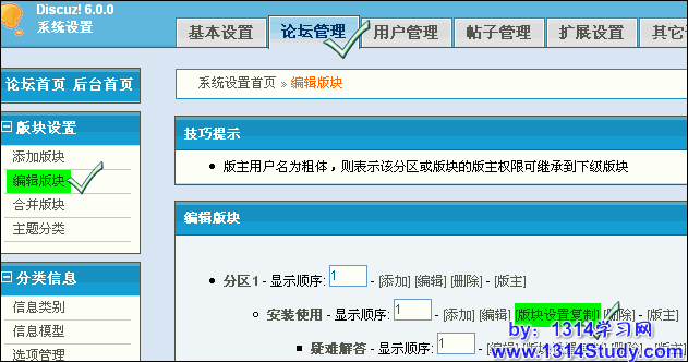 进入论坛后台“系统设置 -> 论坛管理 -> 版块设置 -> 编辑版块 -> 版块设置复制”,如图 1 所示: