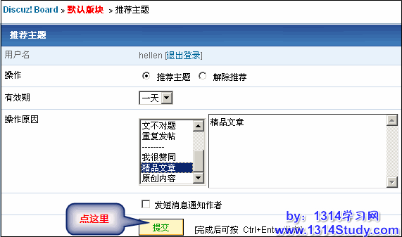设置方法:当开启推荐主题后,版主就可以向用户推荐认为比较好的主题,如图 13 、14 所示:
