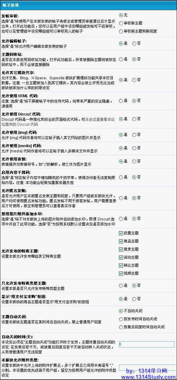 设置本版块主题是否在某时间后自动关闭,禁止普通用户回复,可以按发布时间自动关闭或者按最后回复时间自动关闭