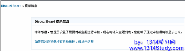 选择“是”效果如图 17 所示将使用户在本版发表的帖子待版主或管理员审查通过后才显示出来,打开此功能后,您可以在用户组中设定哪些组发帖可不经审核,也可以在管理组中设定哪些组可以审核别人的帖子(在同一条件下组权限大于版块权限)
