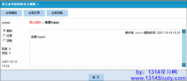 说明:版块开启回收站并删除了贴子后,可以在后台设置 -> 贴子管理 -> 贴子相关 -> 主题回收站里搜索找到。效果如图 18 所示,可以还原或者删除。同时开启主题回收站可以避免误删除贴子后无法恢复的后果。