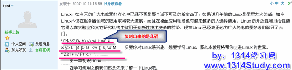 选择“是”将在帖子内容中增加随机的干扰字串,使得访问者无法复制原始内容。效果如图 24 所示: