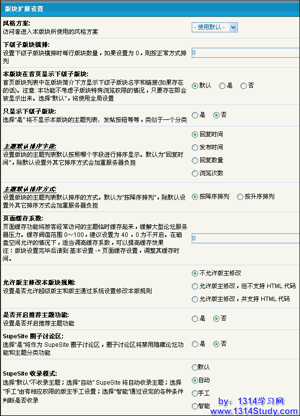 注意:版块设置完毕后请到 基本设置 -> 页面缓存设置,调整其缓存时间。