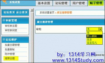 打开“系统设置”,点击“帖子管理”里的“推荐主题”,选择合适的版块。如下图所示: