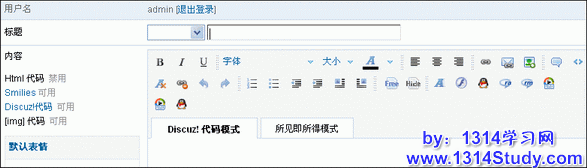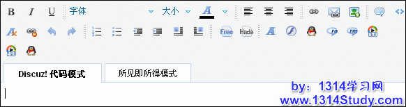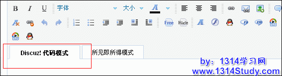 选择了是之后,那么在发帖和回复的编辑器就可以看到Discuz! 代码和模式见即所得模式的按钮了。如图 14 所示: