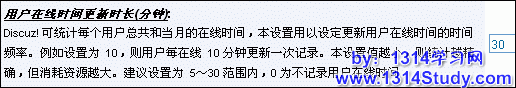Discuz! 可统计每个用户总共和当月的在线时间,本设置用以设定更新用户在线时间的时间频率。例如设置为 10,则用户每在线 10 分钟更新一次记录。本设置值越小,则统计越精确,但消耗资源越大。建议设置为 5~30 范围内,0 为不记录用户在线时间