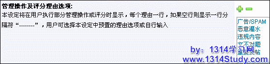 本设定将在用户执行部分管理操作或评分时显示,每个理由一行,如果空行则显示一行分隔符“--------”,用户可选择本设定中预置的理由选项或自行输入