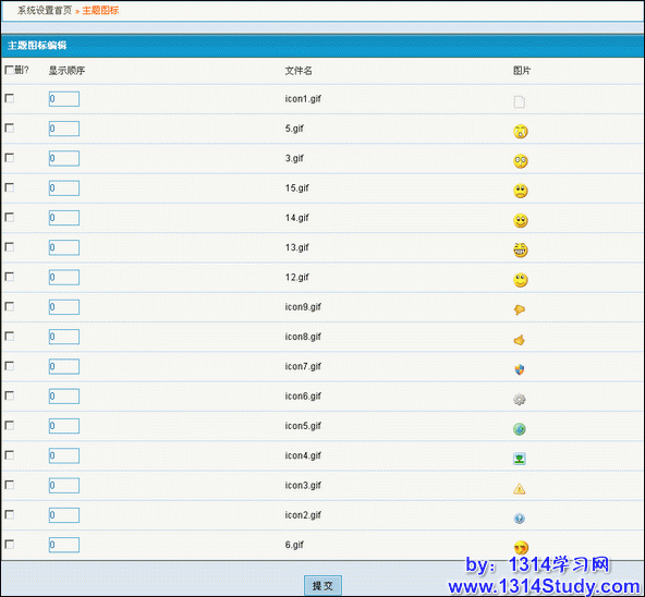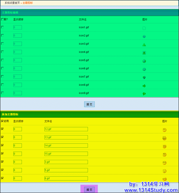 二、打开“系统设置”,点击“帖子管理”的“主题图标”,可以看到如下图所示的界面。绿色部分是论坛自带的主题图标,即可以使用的图标,黄色部分是在第一步添加的图标,现在还未添加到主题图标的行列,这种状态下,黄色部分的图标是无法使用的,需要启用图标。启用图标的方法是:选择要启用的图标后,点击提交。这里可以为主题图标修改名称,在“文件名”一列修改。