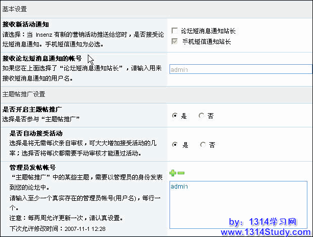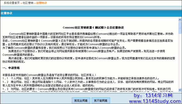 安装或者升级到Discuz!6.0后,用论坛创始人管理员登录到论坛后台可以看到社区营销的菜单,如图 1 所示: