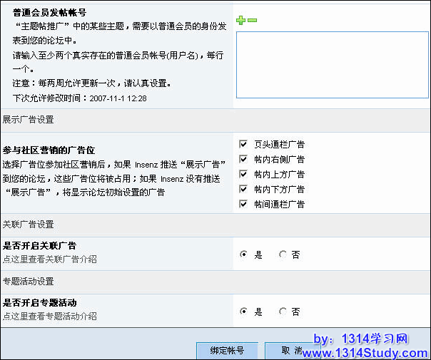点提交后可以看到如图 5 、6 所示的界面, 对社区营销进行初始化设置,建议站长把关联广告和展示广告都开启,完成后还可以在论坛后台进行设置等操作。