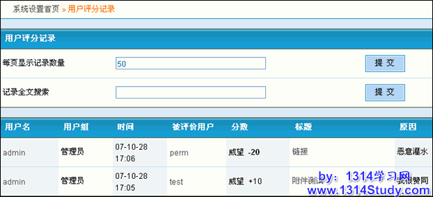 用户评分记录记录着在所有用户的评分记录,就是用户是否是在恶意评分或者版主评分是否不公正,都做到有证可查。这个记录同样可以通过 用户名,被评用户名,分数,标题,原因进行全文搜索你要的记录。
