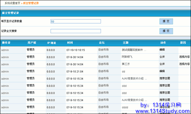 版主记录记录着版主进行的所有操作,就是可以知道版主进行了说明操作,这个同样可以全文搜索,搜索需要的记录。
