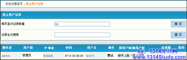 禁止用户记录,记录着管理组对用户的禁止操作,当解封或者查看其他人的操作的时候,可以有根据。这个也是可以全文搜索相应的记录。