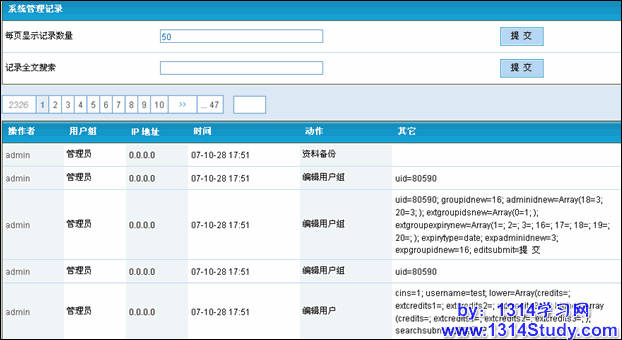 后台访问记录,顾名思义,就是管理组的成员户访问后台的记录,这个无论访问后台那个动作,都会有记录,真正的提交后,就是真正执行了修改,那么在其他那个选项就会出现一些特殊的字符,其实就是sql的片段。所以这个记录很重要,可以了解到访问后台的管理组的人员,到底执行了说明操作。这个同样支持搜索。