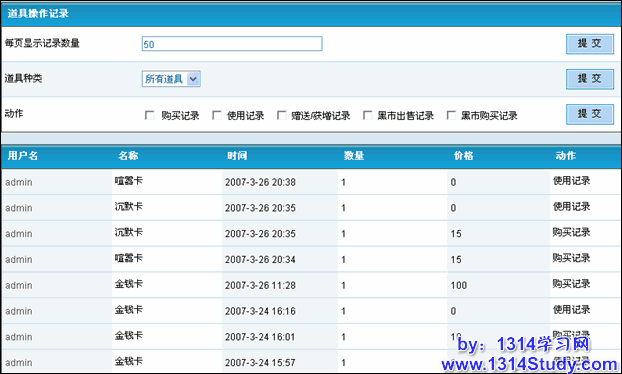 道具操作记录是记录着前台道具市场的购买,和用户使用道具的记录。通过这个记录可以比较全面的了解当前道具的使用情况。这个记录是存储在数据库里面的,所以搜索的条件比较多,可以很精确的搜索除您需要的记录。