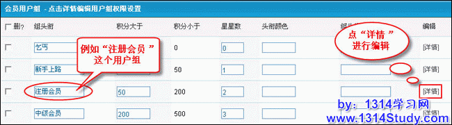 1、 进入“系统设置”-“用户管理”-“用户组”:选择一个您要给其道具使用权限的用户组,比如“注册会员”,点“详情”,如图 1 所示: