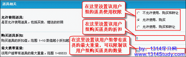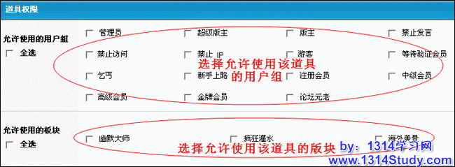 下面主要按两个部分讲解道具的启用设置:针对用户组的权限开启和针对道具的权限开启。