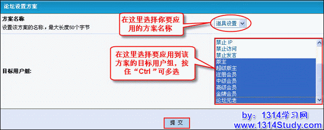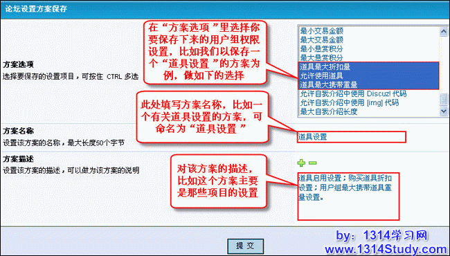 至此,针对用户组的道具开启方法估计大家已经很明白了,您无需对每个用户组挨个开启并设置道具功能,您只需要对一个用户组进行道具开启设置并保存一个“用户组设置方案”,这样,对于其他用户组,您只需要应用该用户组设置方案即可,很简单易用吧!