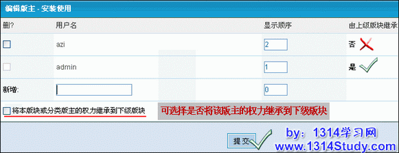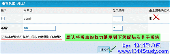 填写版主的用户名、其显示顺序、选择是否将本版主的权力继承到下级版块,然后“提交”即可,如图 4 所示: