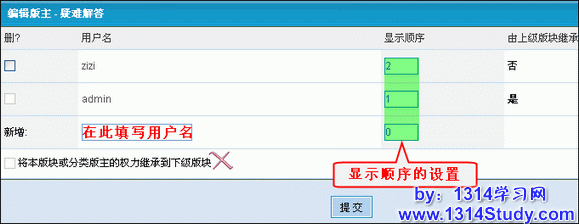 添加比较简单,填写版主的用户名和显示顺序后“提交”即可,如图 2 所示: