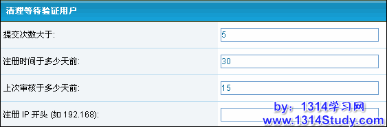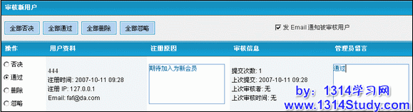 审核用户有两个方面的内容:清理用户和审核用户。清理用户是指批量删除一些等待验证的用户,审核用户可以否决,通过,删除,忽略等待验证的用户。