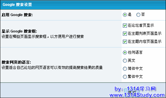 2)、显示 Google 搜索框:设置在哪些页面显示搜索框,以方便用户进行搜索。主要有三个位置选择:“在论坛首页显示”、“在主题列表页面显示”、“在主题内容页面显示”,可以多选。