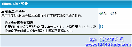 2、SiteMap 缓存有效期:设置 SiteMap 缓存更新的时间,单位为小时。数值设置为1~24,默认为12,建议单位更新时间内论坛新增的主题数不要超过500。