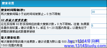 1)、搜索时间限制(秒):两次搜索间隔小于此时间将被禁止,0 为不限制,默认为 30,单位秒。