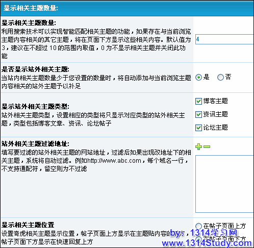 1)、显示相关主题数量:利用搜索技术可以实现智能匹配相关主题的功能,如果存在与当前浏览主题内容相关的其它主题,将在页面下方显示这些相关内容。默认值为 3,建议在不超过 10 的范围内取值,0 为不显示相关主题并关闭此功能。