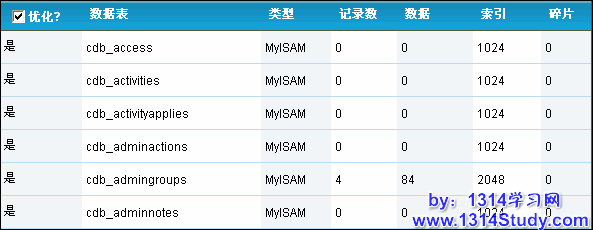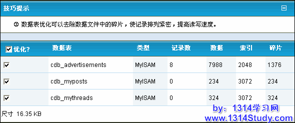优化数据库到此已经基本介绍完毕,如果您的论坛运行了一段时间,您可以到后台使用该功能优化下有碎片的数据表,充分利用空间,还可以提高论坛读取速度哦。