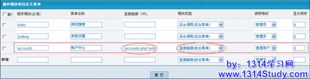 直接链接(前台菜单):可在前台右上角加入一个菜单项,可自主指派菜单链接的 URL。注意:由于引用外部程序,因此即便设置了模块的使用等级,您的程序如需权限判断,仍需要引用 common.inc.php 和插件相关的缓存文件,并自行判断使用等级是否合法。
