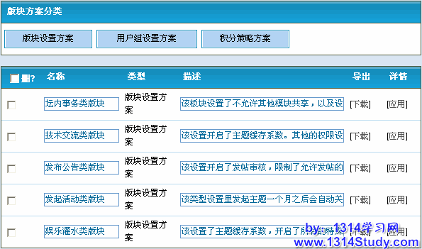 可以看到,论坛设置方案包括三部分:版块设置方案,用户组设置方案和积分策略方案。