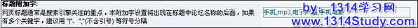 网页标题通常是搜索引擎关注的重点,本附加字设置将出现在标题中论坛名称的后面,如果有多个关键字,建议用 "|"、","(不含引号) 等符号分隔,如图 1 所示: